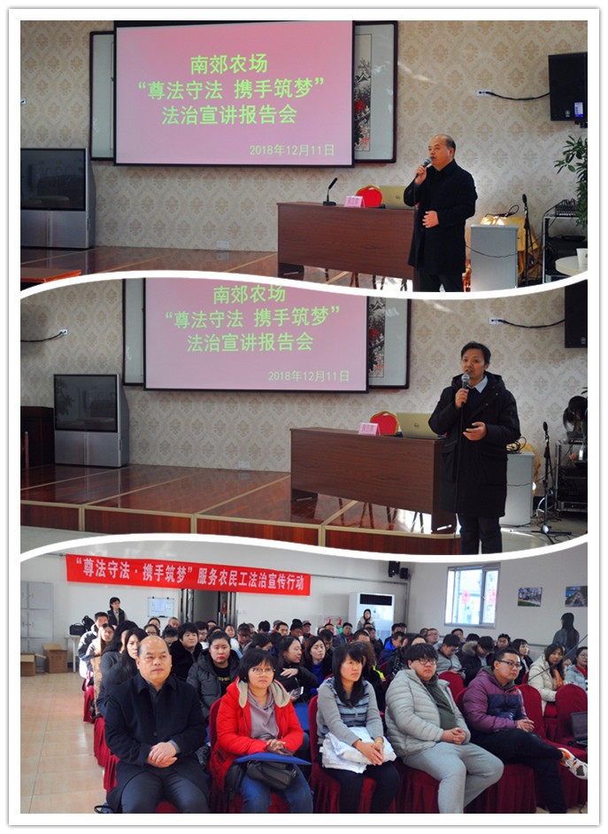 12月11日下午,北京师范大学“尊法守法·携手筑梦”服务农民工法治宣传行动小分队一行5人来到位于北京市大兴区的首农集团南郊农场,开展2018年第三场法治宣传活动。北京市总工会服务工会副主席田玮,首农集团南郊农场所属四家单位的80余名干部职工参加活动。