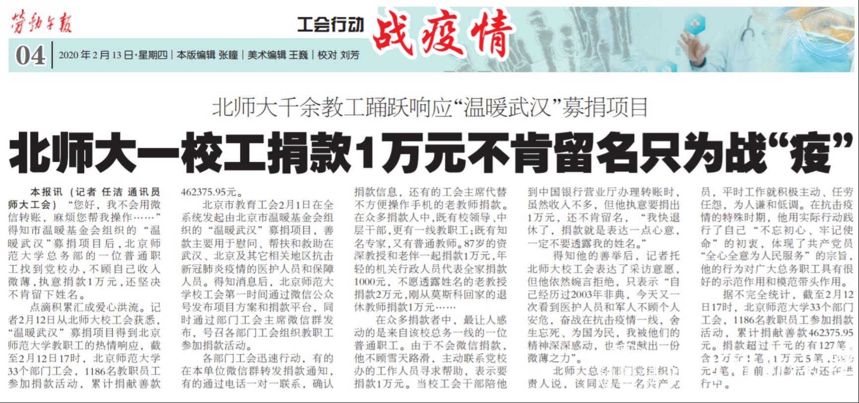 北京市总工会主办的《劳动午报》在2月13日“工会行动战疫情”版面头条新闻报道:北师大千余教工踊跃响应“温暖武汉”募捐项目