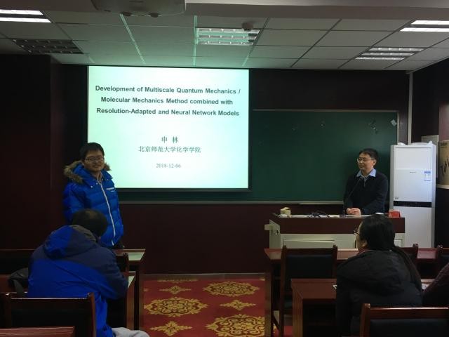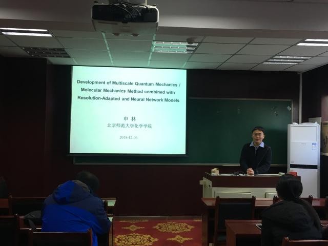 申林老师结合自身的科研经历,做了题为“Development of Multiscale Quantum Mechanics/Molecular Mechanics Method combined with Resolution-Adapted and Neural Network Models”的主题报告,报告深入浅出、内容丰富而详实,引起了相关领域研究工作者和研究生的极大兴趣。随后,申林老师与在座师生进行了热烈的讨论并就相关问题进行了深入的交流。