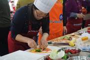 2017年4月7日星期五下午13:30,学五食堂二层备赛区,地理科学学部派出的两支参赛队都已精神饱满准备就绪,分别是由刘喆、孙晓芹、郭焕然三位老师组建的地理科学学部一队,和由黄琳、刘春玲、王伟伟三位老师组建的地理科学学部二队。比赛内容为3道制定菜肴,分别是创意冷拼、醋溜土豆丝和宫保鸡丁。每支队伍都要在30分钟之内独立完成全部3道菜肴,方可参评。面对这样的挑战,六位老师在赛前也并不十分轻松,而是一直群策群力商议比赛过程中的配合、技巧和策略。