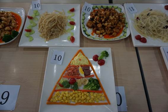 到了正式登场的时刻,学部一队的队长刘喆老师、二队队长黄琳老师都表现得沉稳从容,一丝不苟地处理着各种原材料,队员老师们也各司其职、有条不紊地默契配合。各队教师最终稳定发挥,三道菜品一一出炉,色香味俱佳。其中,一队完成的创意冷拼,除了摆盘精致,更蕴含着“食物营养金字塔”的科学内涵,受到一致好评。
