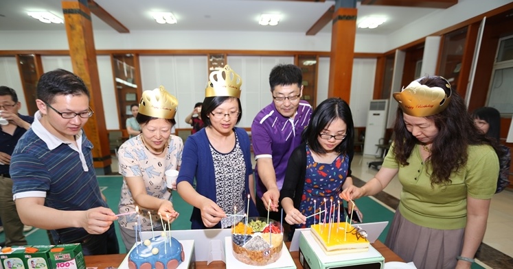 2017年5月17日下午,生命科学学院工会为学院3-5月生日的教职工举办了集体生日会,寿星们与前来祝贺的其他教师们齐聚多功能厅,享受工会提前准备的3款美味蛋糕,同时还有水果、茶点供大家品尝。老师们其乐融融,在品尝糕点同时,畅谈工作生活,增进感情交流。在紧张的工作之余,感受到了学院温暖,得到了一丝放松,收获了满满情谊。
