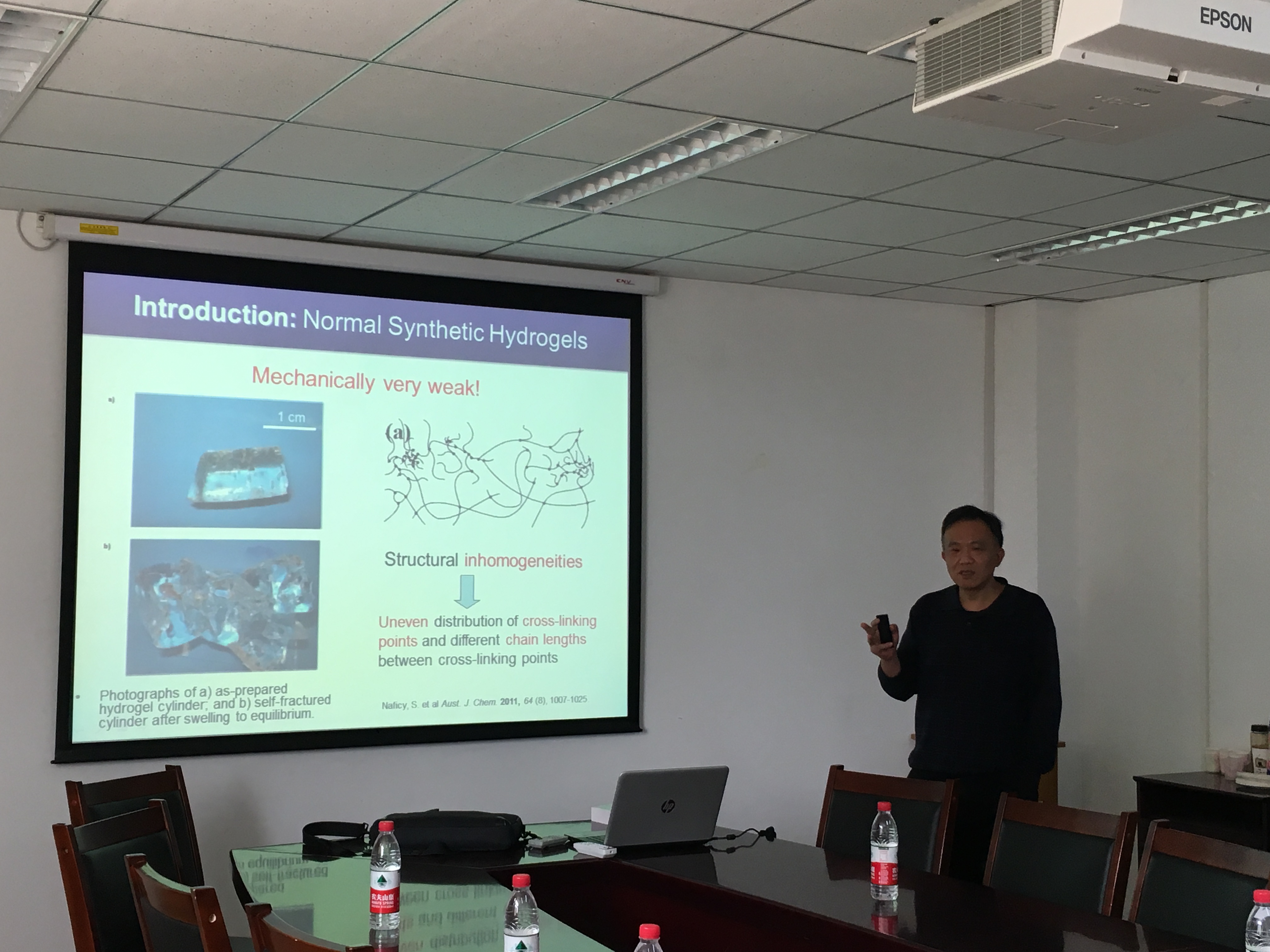 2017年3月16日下午,在化学院工会的组织和促进下,本年度第一期化学学院青年学术沙龙在化学楼314室举行。本次主讲嘉宾是高分子化学与物理专业的汪辉亮教授,化学学院部分青年教师、研究生代表参加了本次活动。汪辉亮教授结合本组科研方向和进展,做了题为“具有优异力学性能的水凝胶”的主题报告,报告结合自身的科研经历,深入浅出、内容丰富而详实,引起了相关领域研究工作者和研究生的极大兴趣。随后,汪辉亮教授与在座师生进行了热烈的讨论并就相关问题进行了深入的交流探讨。