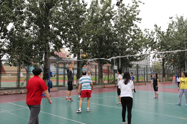 早上八点,各参赛人员陆续到达排球场,经过迅速的分组和热身以后,排球赛拉开帷幕。参赛队伍共有教师队和学生队各两支,教师队由老师自行组成,学生队囊括各年级学生,男女混合组队。