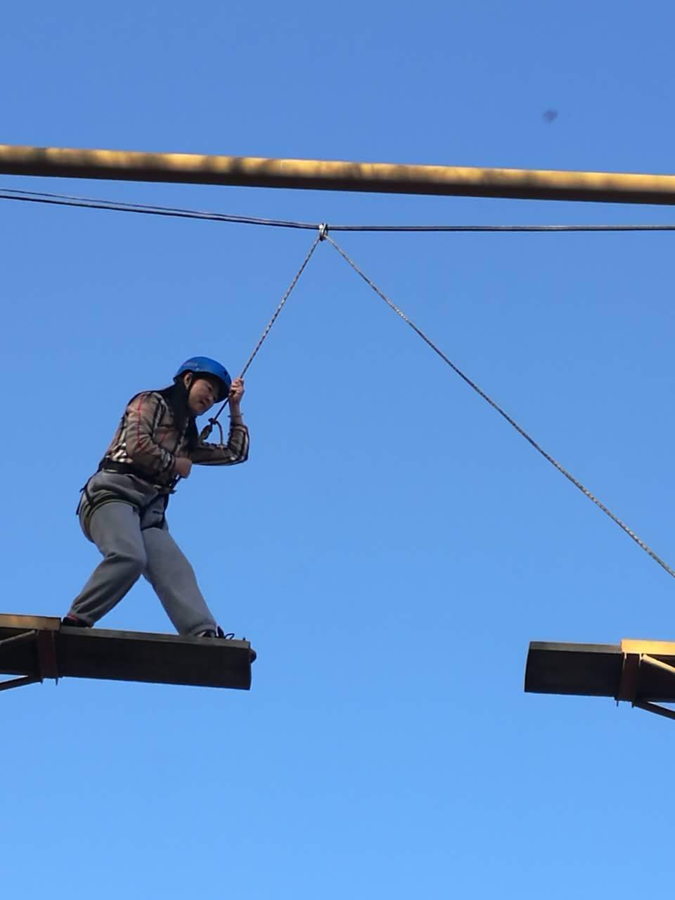 上午9时,经过1个小时的车程队员们来到了拓展基地,连续多日笼罩在北京上空的雾霾也在队员们的阵阵欢笑声中渐渐散去。此次拓展活动包括听数抱团,空中断桥、自由后仰、绑腿龙游四个项目。首先进行的是拓展热身之听数抱团,通过轻松欢快的热身活动,大家打破了彼此之间陌生和隔阂,建立相互了解和信赖。随后培训师把大家随机地分为两队——红队(无敌队)与黄队(屠龙队),两队队员分别选举出各自的队长并创建队名、队旗、队歌和口号,随即开始了个人挑战课程——空中断桥。每个队员独自爬上8米高的平台,平台长约15米宽0.3米,中间有一段约1.2米的缺口,队员自断桥一端跃起,跨至另一端并返回。空中断桥要求队员克服自身的恐惧心理,无视高空带来的恐惧,向着前方目标勇敢跨越。尽管每个队员自身条件不同,但是大家战胜了各自心中的恐惧,顺利完成了挑战。