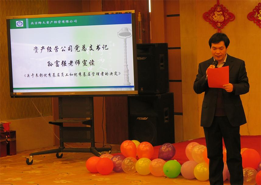 资产经营公司党总支书记孙富强宣读了《关于表彰优秀员工和优秀基层管理者的决定》、资产经营公司总经理助理肖文江老师宣读获得学校“教职工之友”“优秀工会干部”“工会积极分子”荣誉称号的人员名单,资产公司工会主席王术军宣读了公司工会《关于表彰工会工作先进单位和积极分子的决定》及获表彰人员名单。与会领导为获表彰人员颁发了证书。获得优秀基层员工荣誉的代表陈冬妮和获得基层管理者荣誉的代表曹婷婷发表了感言。