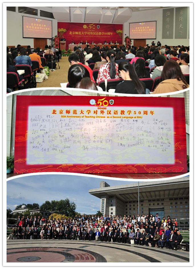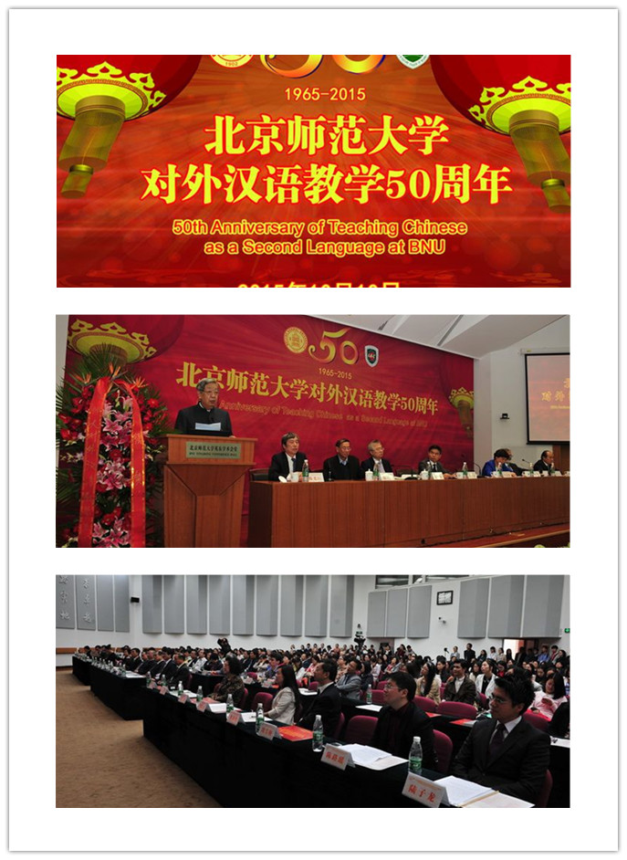 在汉语文化学院党政领导、院工会以及全体教职员工的精细筹备下,2015年10月10日10时10分10秒,北京师范大学对外汉语教学五十周年庆典在英东学术会堂隆重举行。庆典由北京师范大学陈光巨副校长主持。北京师范大学校长董奇、国家汉办主任许琳、世界著名活动家华赞、北京外国语大学党委书记韩震、北京第二外国语学院校长曹卫东、原驻美教育公参钱一呈出席本次庆典并致辞。一同出席庆典的还有来自北京大学、华东师范大学、山东大学、天津大学等兄弟院校的同仁,以及汉语文化学院全体教师和百余名中外学生。会上,教师代表陈绂教授、朱志平教授,毕业生代表台克勤同学、在读学生代表陈路遥同学和留学生代表陆子龙同学分别发言。