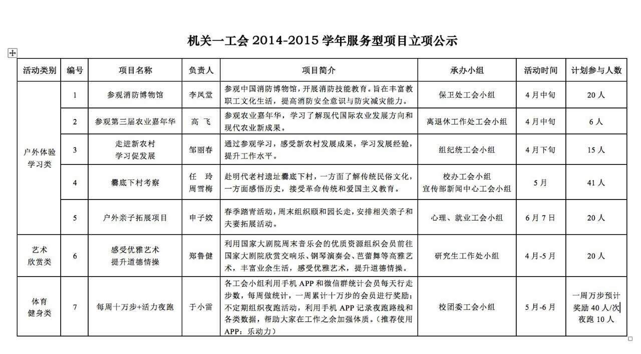 2014年4月15日,机关一工会对申报项目进行了评审,工会主席、副主席、委员及各小组组长参加了评审,大家严把标准、群策群力,从活动主题、内容、参加人员、预算、可行性等多个方面科学细致地对各个小组提交的项目建言献策,通过了包括“户外体验学习类”、“艺术欣赏类”、“体育健身类”等共计七项活动(详见附件一)。