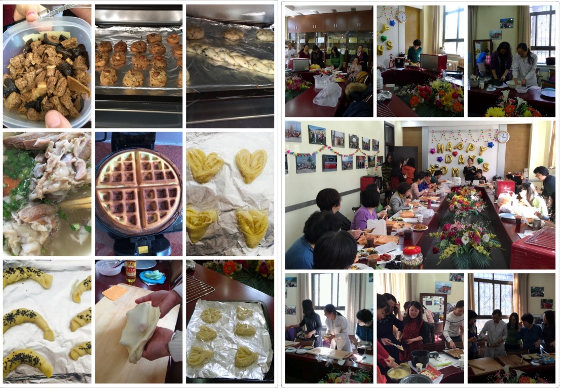 2015年3月11日全天,物理学系30名女教工在物理楼105工会活动室隆重举办庆祝“三八”国际劳动妇女节活动,请系内烘焙大师何琛娟老师、刘卫荣老师、冯倩老师带领全体姐妹现场学习烘焙技术。老师们现场学习了烤面包、烤蛋糕、烤饼干、烤华夫饼。中午老师们带来了自制的凉菜、棒骨汤、各地零食,大家在一起愉快聚餐、畅谈,共度了一个愉快的妇女劳动节。会后老师们回家纷纷实践,不断有老师在微信群里上交学习结果,烘焙热情高涨。稍后还会在群里继续交流烘焙经验,使生活更加有滋有味。