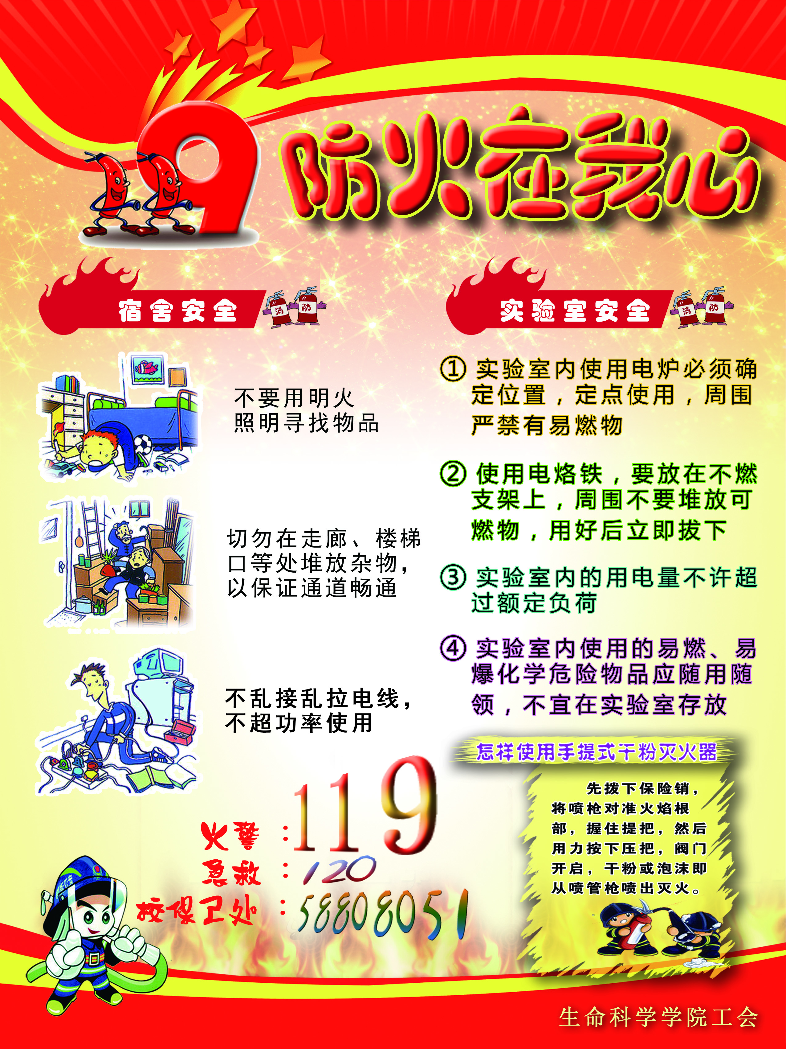 在宣传展板制作过程中,生科院结合学院工作实际,着重从“宿舍安全”和“实验室安全”两大方面入手,帮助师生提升安全意识,掌握安全常识,起到了较好的宣传效果。经评选,我院工会获学校“119”消防宣传展览二等奖。
