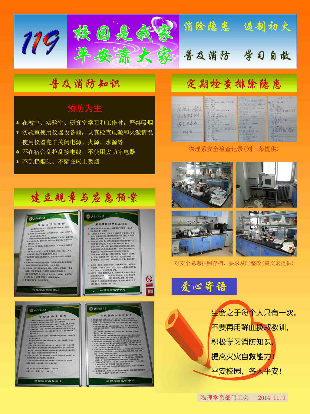 消防宣传展览。物理系部门工会针对此次宣传活动,结合消防法规和本单位情况,设计了主题为“校园是我家,平安靠大家”宣传展板。展板除普及消防知识,还展出了物理系定期检查的结果记录、实验室消防安全制度等等。展板图文并茂,在主楼展出后,达到很好的宣传效果。经评选获校“