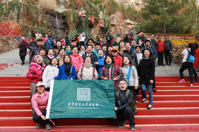 钟灵毓秀的坡峰岭位于北京城西南约52公里处的房山区境内,被《国家地理》杂志誉为华北最壮观的山地红叶景观,山上红叶以黄栌为主,并伴有元宝枫、火炬等七八个品种。同时,坡峰岭所在的黄山店村也是“红色背篓”精神的摇篮及传承地,60多年前,原房山县周口店供销社黄山店分销店负责人王砚香带领党员职工长年背篓上山,无论刮风下雨,坚持送货上门,被乡亲们亲切地称为“背篓商店”。他们持之以恒为人民服务的精神得到了百姓的高度认可,“背篓商店”也成为了全国财贸战线的一面旗帜。1965年电影《红色背篓》的主人公王福山的原型,就是“背篓商店”的发起人王砚香。上午9点钟,馆员们到达坡峰岭入口,馆工会首先组织馆员进行了热身运动。集体合影后,大家开始赏秋健康长走活动。时值深秋,坡峰岭正在举办2019年红叶节。馆员们沿着石阶,拾级而上,山路两旁茂密的黄栌树五彩斑斓,站高远眺,红、黄、绿、粉、黑,与蓝天、白云交相辉映,恍若一幅繁茂磅礴的秋景油画。馆员们三三两两行走于山间,不停按下快门,留住坡峰岭的艳丽秋景。