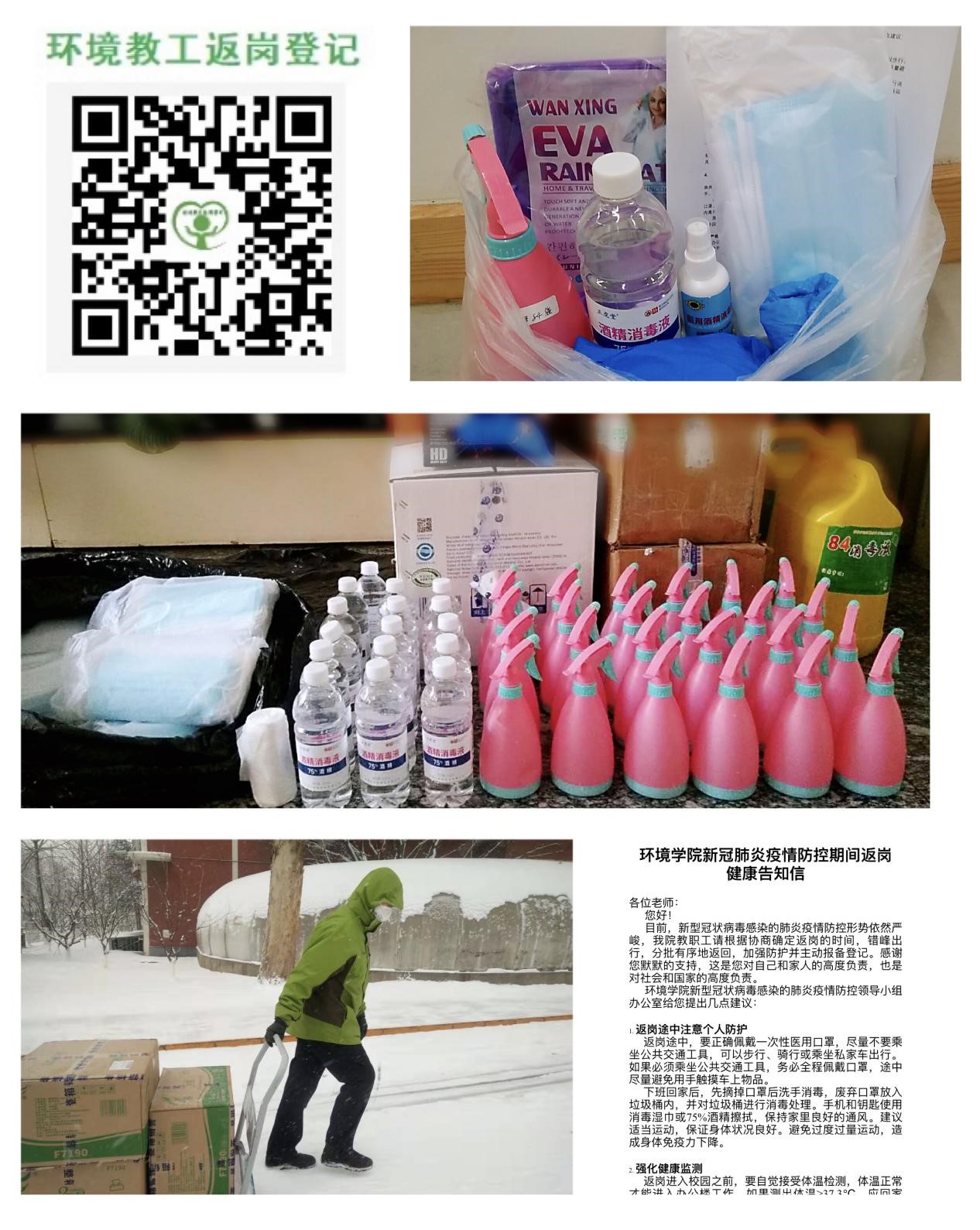 三是落实物资,关爱员工传递真情。在疫情爆发初期,环境学院办公室组织筹建了由办公室和实验室代表组成的“学院疫情防控后勤工作组”,按照集中管理、统一调拨、采储结合、节约高效的原则,建立了从日常消毒到物资储备的“全链条”疫情服务保障体系。在张珺老师的带动下,工作组不分昼夜,广泛搜寻,多方比对,积极筹措;值班室王明启和郝书月两位同志积极配合,栉风沐雪,不辞辛苦一趟趟从物流集散点拉回防疫物品,再加班加点将物品进行分装整理。在教工返岗前的最后一刻定制出30余份含口罩、消毒液、雨披、鞋套、一次性手套等贯穿全身防护的“环境学院消毒防疫包”,为学院教工的返岗做到了全方位贴心的保驾护航。