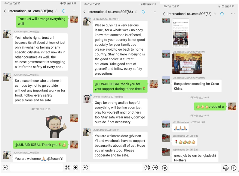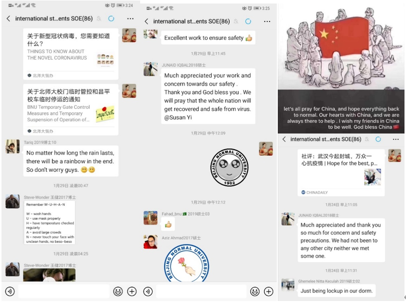 值得一提的是,环境学院的英文授课项目在这场“战疫”中也丝毫不受影响,面对留学生上课的时差、线上通讯网络信号、以及软件的语言设置问题,都做好了积极预案。留学生对课程的情况反馈良好,对线上教学的积极性和互动需求也非常高。学生们不仅全力配合学校学院的防疫工作,还反过来鼓励和感谢学院的中国教师们,在严峻形势下给予他们的精神和物质关怀。他们还通过社交媒体表达支持中国,为武汉加油打气。留学生群里同学们互相安抚,科普新冠病毒知识,以理性乐观的心态面对疫情。