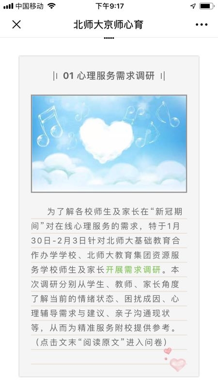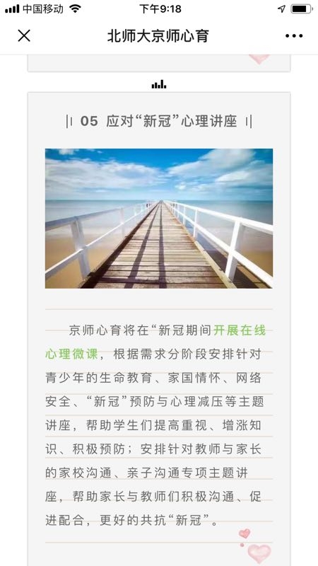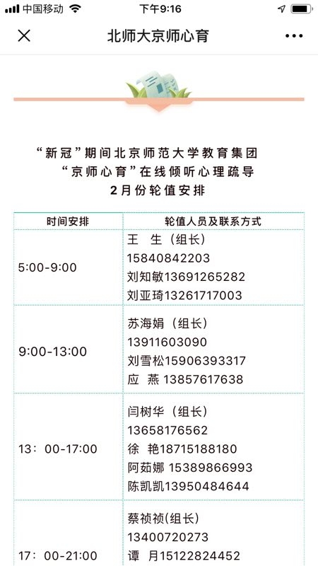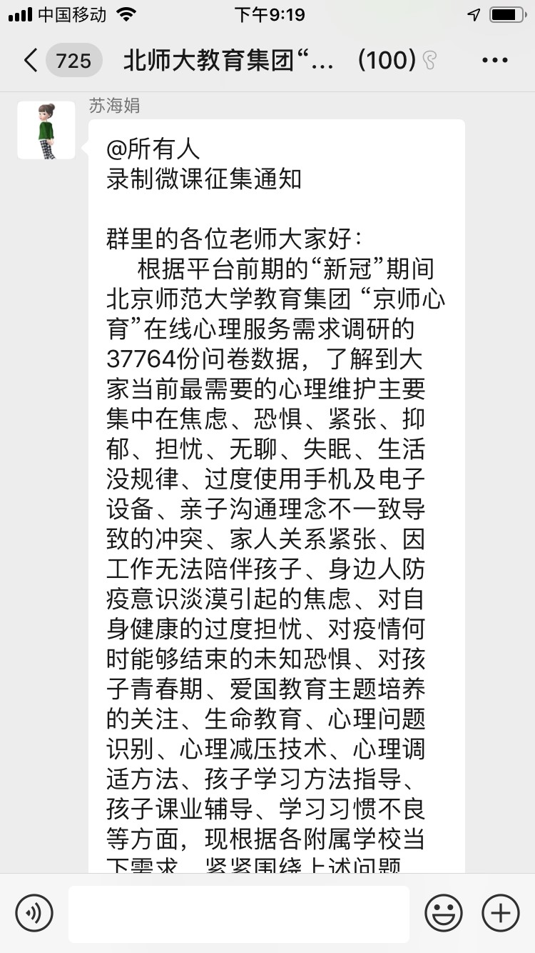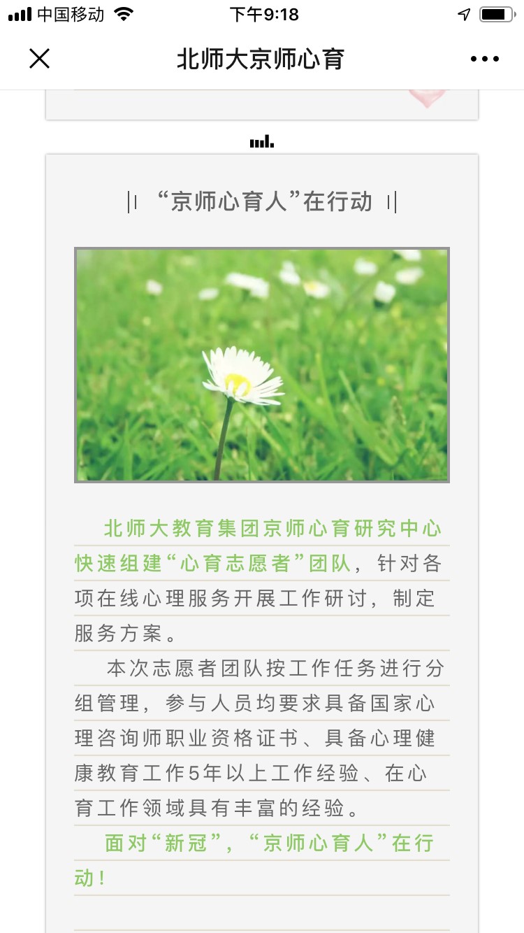 今年“新冠肺炎”疫情爆发伊始,为认真贯彻落实党中央、学校和资产经营公司的相关工作部署和要求,北京师大资产经营有限公司所属教育集团(以下简称“教育集团”)第一时间加入抗击疫情阻击战。其中,教育集团京师心育研究中心充分发挥自身优势,于1月29日迅速启动“新冠期间”线上心理服务行动计划,快速组建起“京师心育线上心理服务志愿者团队”,及时为广大家长、师生和其他各界人士提供专业的线上心理志愿服务。