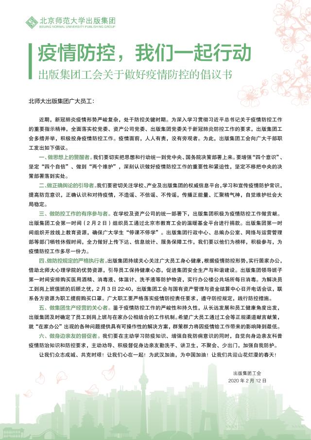 近期,新冠肺炎疫情形势严峻复杂,处于防控关键时期。为深入学习贯彻习近平总书记关于疫情防控工作的重要指示精神,全面落实校党委、资产公司党委和出版集团党委关于新冠肺炎防控工作的要求,出版集团工会多措并举,积极投身疫情防控工作。疫情面前,人人有责,没有旁观者。为此,出版集团工会向广大干部职工发出如下倡议。