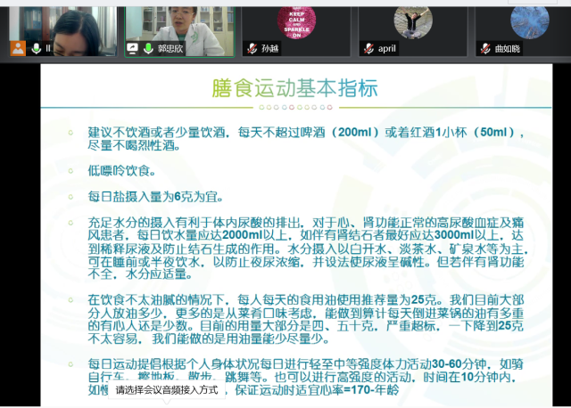 健康的体魄离不开健康生活,要了解关注自己身体指标,加以健康饮食。疫情期间更要保证均衡膳食、合理营养,多吃新鲜食物,保证食物多样。针对心血管疾病预防以及骨质疏松预防,郭大夫也专门给出了合理性建议。最后郭大夫总结健康生活方式为规律作息,乐观心态;合理膳食,低脂低盐;戒烟限酒,适量运动;定期体检,接种疫苗。
