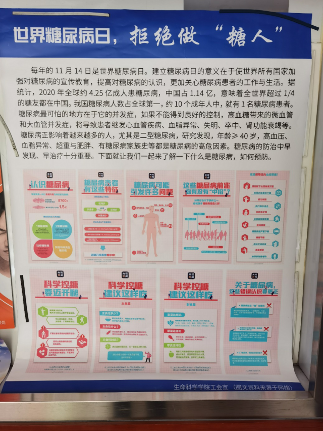 生命科学学院工会围绕这一主题制作了糖尿病知识图解宣传海报,向全院师生普及糖尿病相关知识,为学院教职员工健康保驾护航。