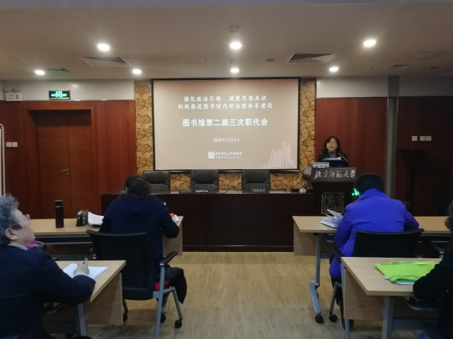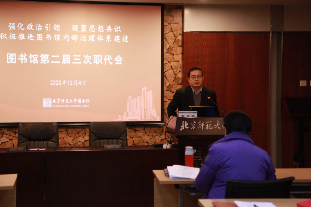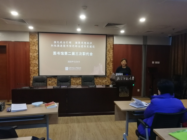 2020年12月4日上午,图书馆第二届三次职代会在一层会议室召开。本次大会的主题是:强化政治引领,凝聚思想共识,积极推进图书馆内部治理体系建设。图书馆职代会代表、列席代表共28人参加会议。会议先后由工会主席李永明、执委会主任卿蔚主持。