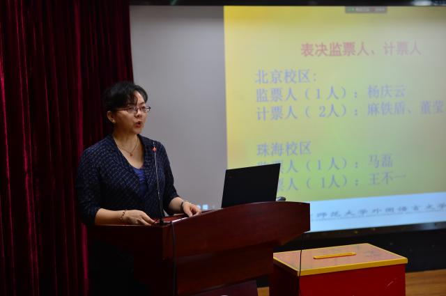 之后,选举正式开始。外文学院工会副主席杨庆云老师介绍了新一届工会候选委员的基本情况。与会会员以举手表决方式通过了选举监票人、计票人人选。随后,根据《工会换届选举大会章程》,北京、珠海两个校区的参会教职工进行现场不记名投票。在等待计票和唱票结果的间隙中,学院教代会代表孙晓慧老师向大会通报了学校教代会的内容。最终在全院教师的共同见证下,投票选出新一届外文工会委员会。代素霞、王筱晶、王德亮、张林和谭雅雯老师当选新一届外文学院工会委员。