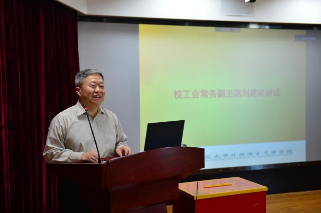 首先,刘建武老师代表校工会致辞。他介绍了前一天闭幕的学校教代会的基本情况和校工会近期工作的成效,回顾了与外文工会的渊源,如数家珍般梳理了外文学院工会在学校工会工作中的贡献和努力,对外文工会未来工作寄予厚望。