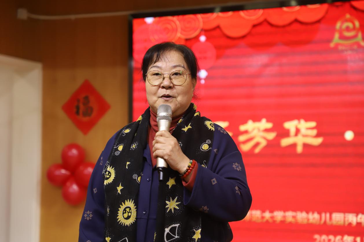 团拜会在热闹欢腾的幼儿节目《醒狮》中正式拉开帷幕。随后,幼儿园党委书记杜军发表了热情洋溢的开场致辞,向老教师们致以诚挚的新春问候,感谢他们为幼儿园发展奠定的坚实基础和做出的卓越贡献。总园长夏华颖向老教师们汇报了幼儿园发展的新貌与成果,回顾了集团政工携手慰问85岁老教师的温暖场面,也向老教师发出征集创设园史馆历史材料的倡议。曾任幼儿园园长的退休教师代表何炳珍和徐翠凤也登台讲话,言语中充满了对往昔岁月的深情回忆和对幼儿园发展前景的美好祝愿。